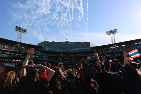 Northeastern graduates celebrate as fireworks explode above Fenway Park. The stadium held over 4,600 graduates during this year’s ceremony.