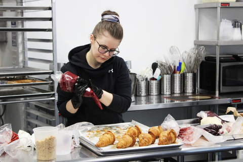 Irina Znakharchuck pipes strawberry poppyseed filling into croissants at Solodko Boston, a Ukrainian bakery in Brighton. Her sister Ilona began selling pastries to friends and professors at Boston College before the sisters opened a storefront in November.